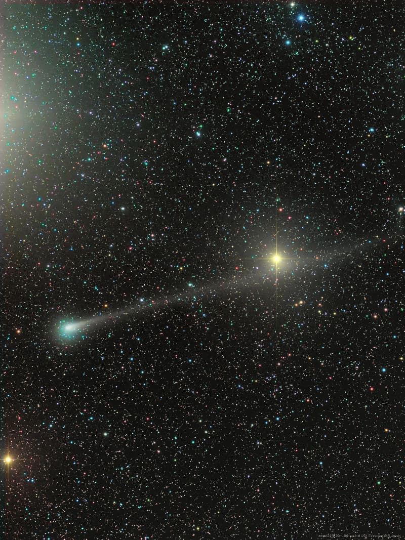 Returning along its 6.4 year orbit, periodic comet Churyumov-Gerasimenko (67P) is caught in this telescopic frame from November 7. Sweeping past background stars in the constellation Gemini the comet's dusty tail stretches toward the upper right to Upsilon Geminorum. Also known as Pollux, Beta Geminorum, Gemini's brightest star, shines just off the upper left edge of the field-of-view. Churyumov-Gerasimenko reached its 2021 perihelion or closest approach to the Sun on November 2. At perigee, its closest approach to planet Earth on November 12, this comet was about 0.42 astronomical units away, though it remains too faint to be seen by eye alone. The well-studied comet was explored by robots from planet Earth during its last trip through the inner solar system. It's now famous as the final resting place for the historic Rosetta spacecraft and Philae lander.